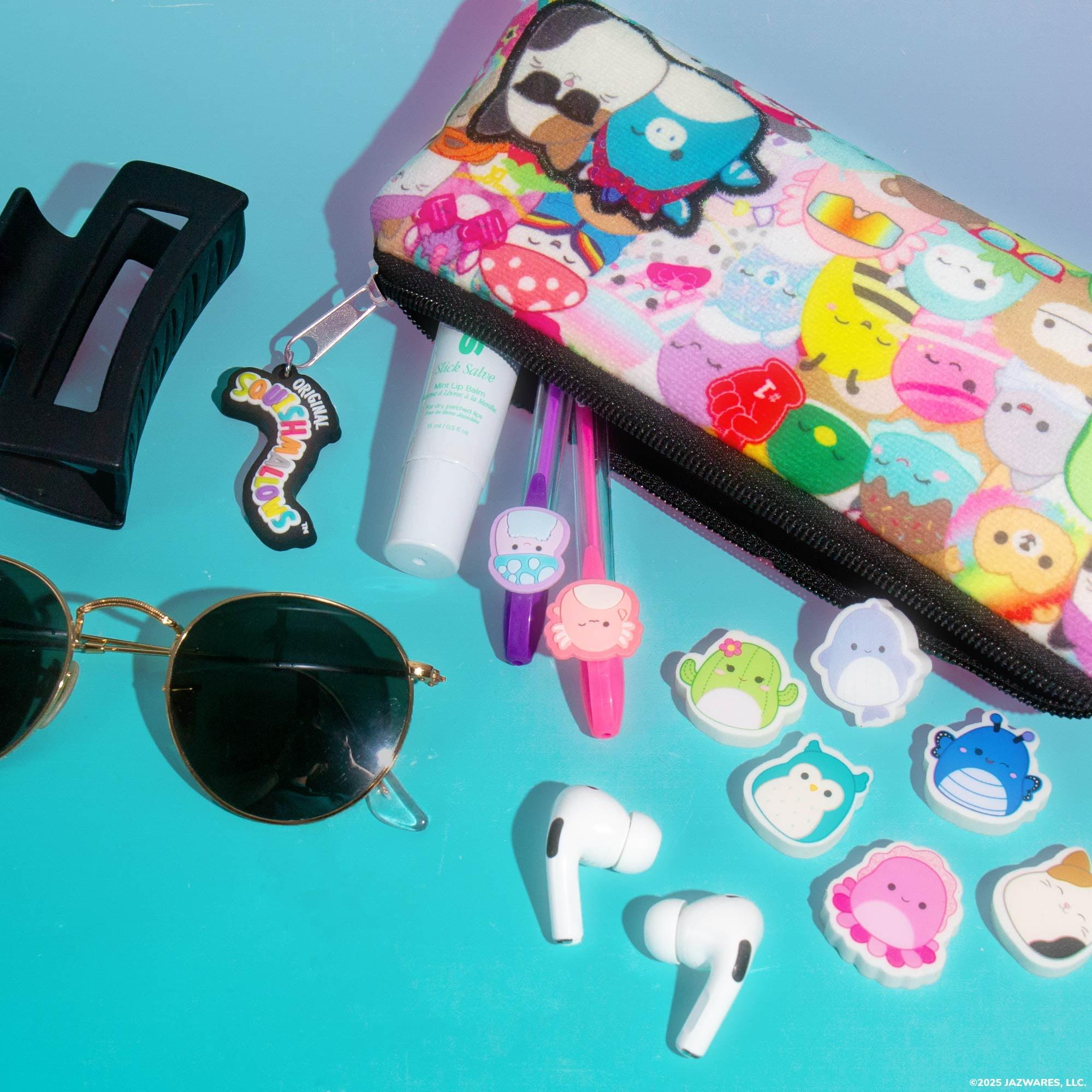Take your creativity wherever you go with the Original Squishmallows Pencil Pouch! Perfectly sized at 7.5 by 9 inches, it’s roomy and flexible enough to carry all your essentials — from pens and pencils to keys, headphones, lip balm, and more! Made from soft polyester, this pouch features the whole Squad in their best back-to-school fits with a special patch starring Tatiana the Dragon and Cam the Cat. The cute Squishmallows zipper is easy to open and close and keeps your supplies secure, so you can toss it in your school or work bag without worry. Whether you are headed to the office, en route to class, or embarking on a creative adventure, this pouch is sure to bring some ’Mallow magic to the journey! Recommended for fans of all ages!