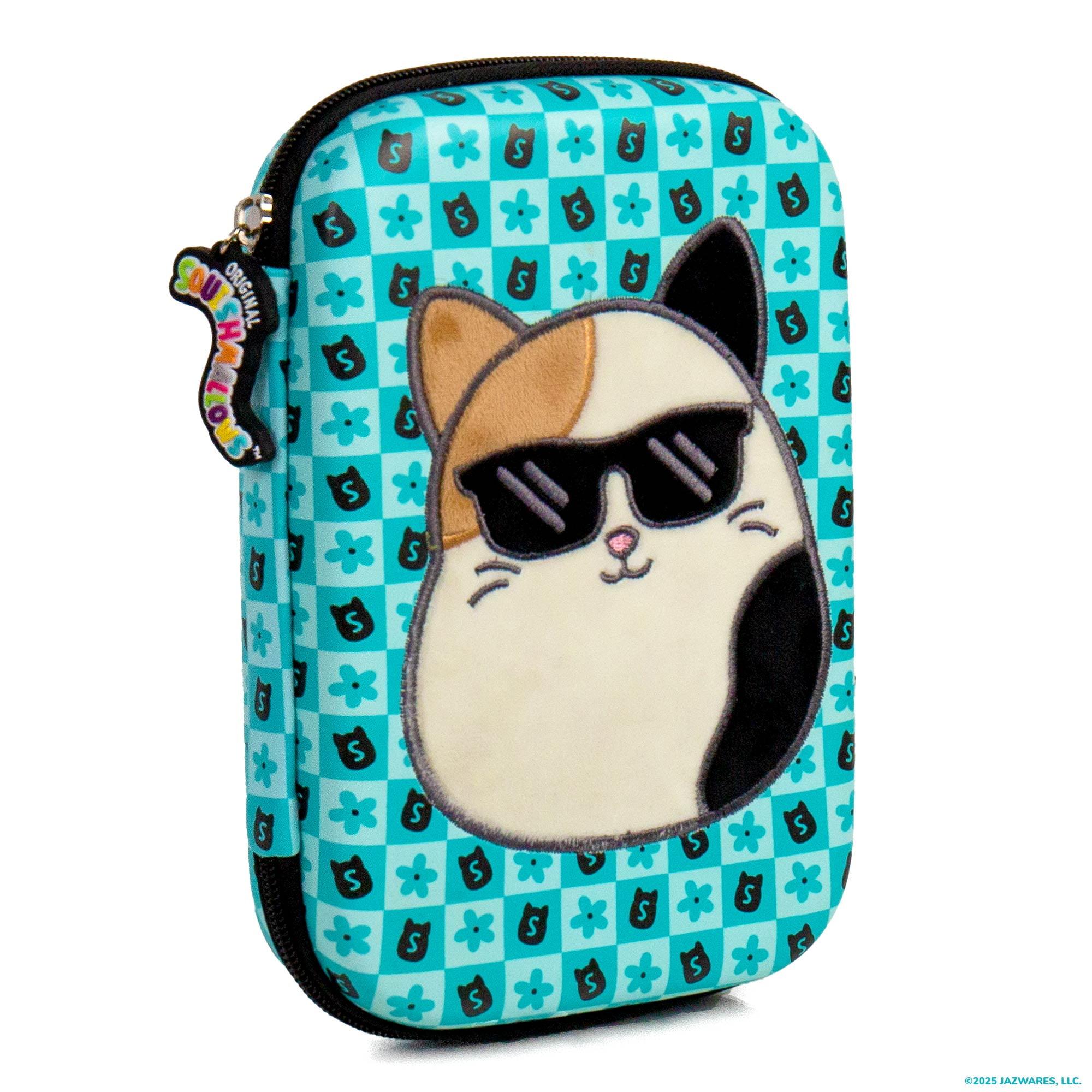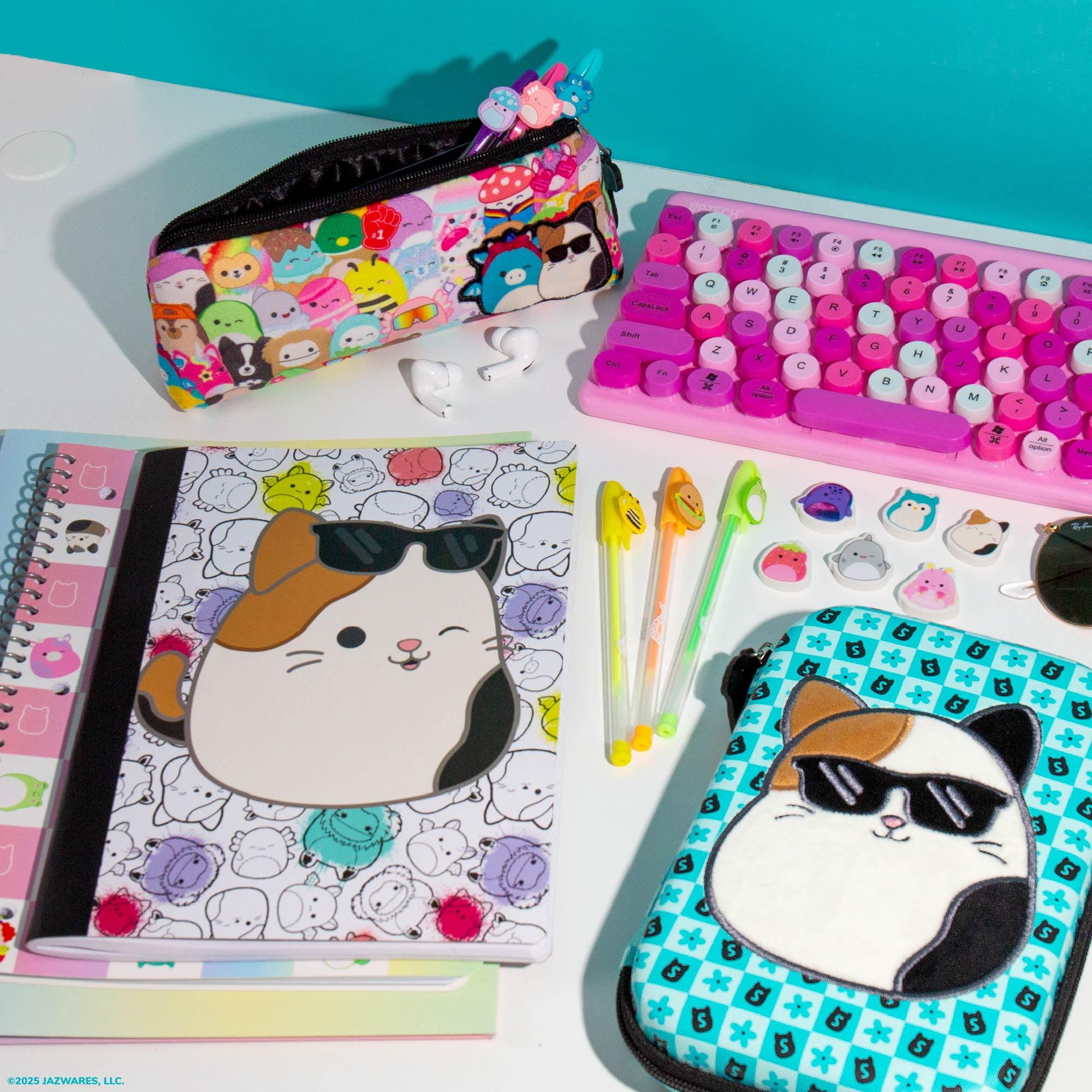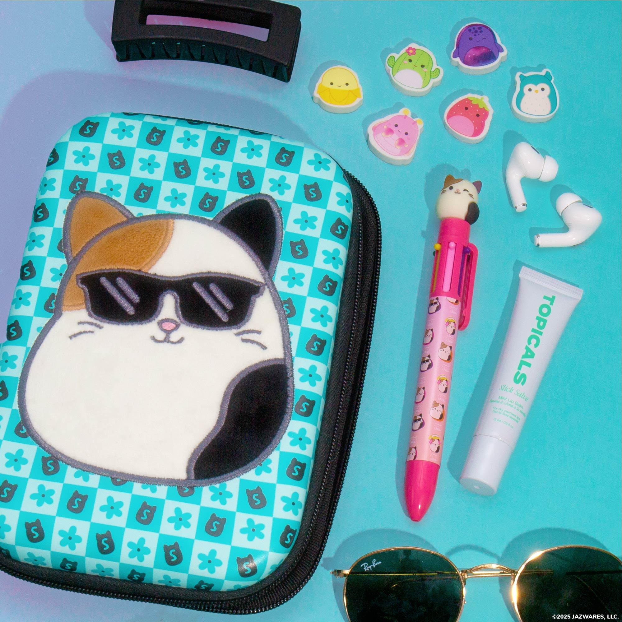 Level up your school and office supplies with the Original Squishmallows Pouch Case! Measuring 5.5 x 8 inches, this compact cutie features a plush Cam the Cat patch on a durable outer shell to protect all your essentials from bumps, drops, and everyday wear and tear. The easy-glide Squishmallows zipper opens to a soft interior, featuring built-in pen loops and a mesh pocket to keep sticky notes, earbuds, and devices organized and accessible. Whether you are headed to the office, en route to class, or embarking on a creative adventure, this pouch is as functional as it is cute. Perfect for Squishmallows fans of all ages.