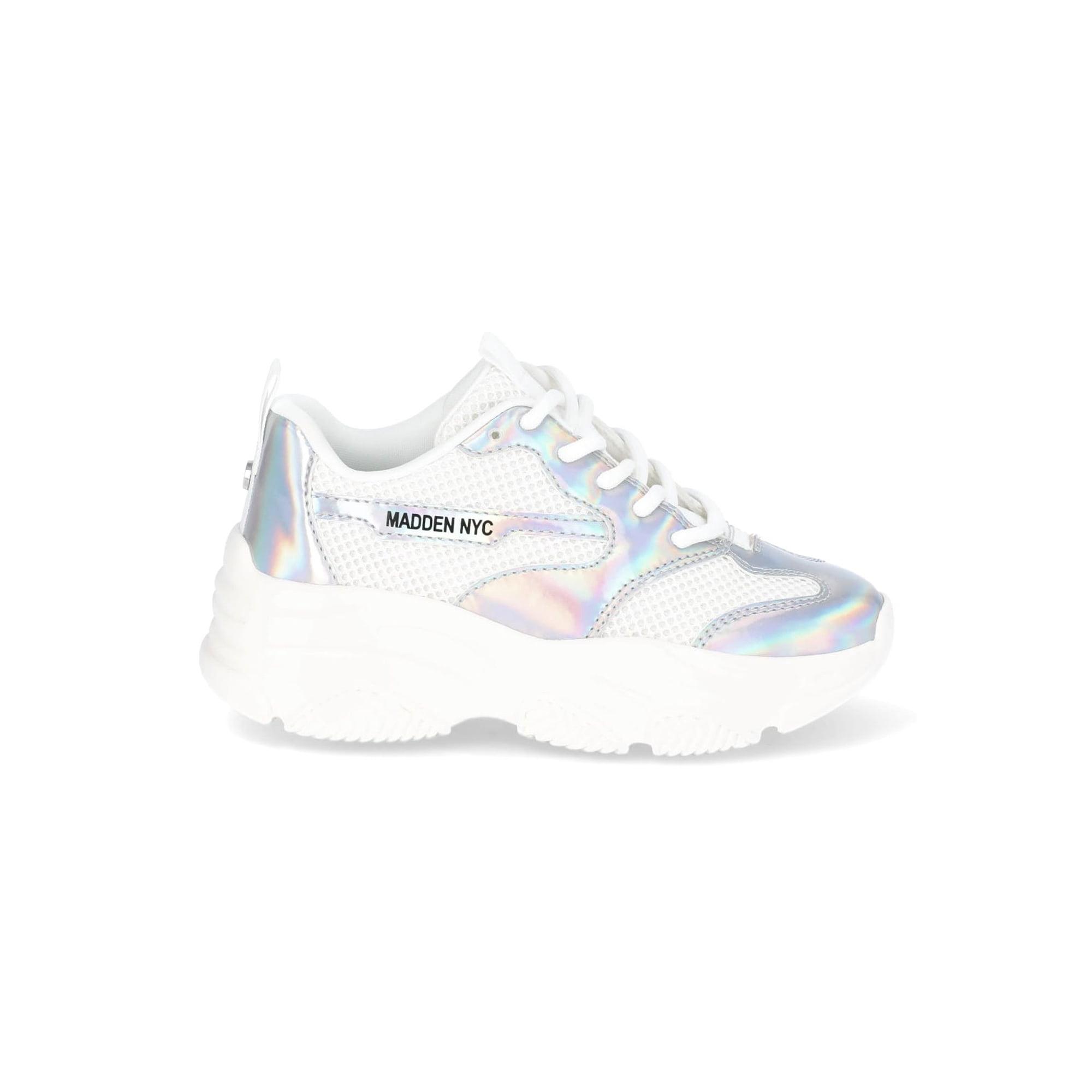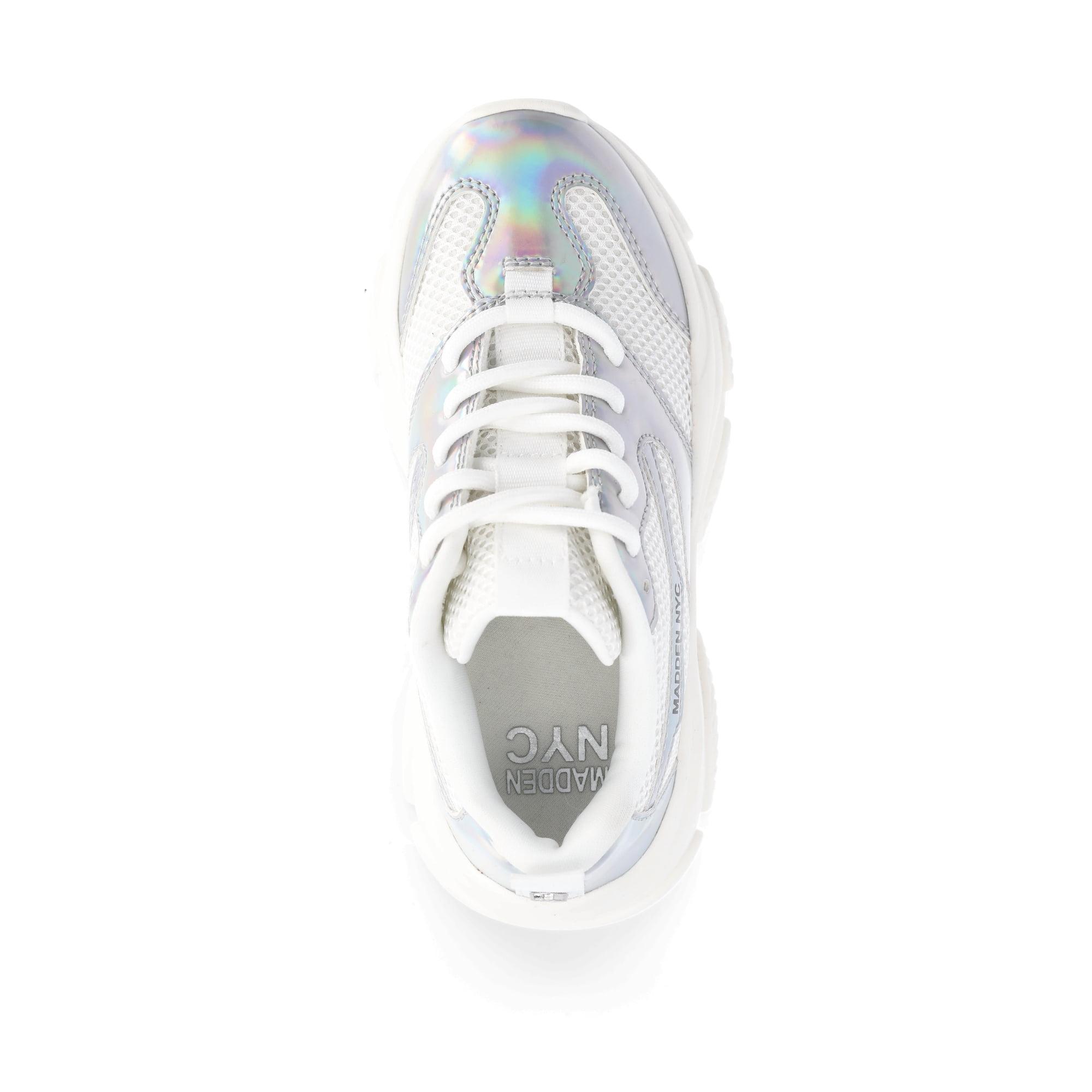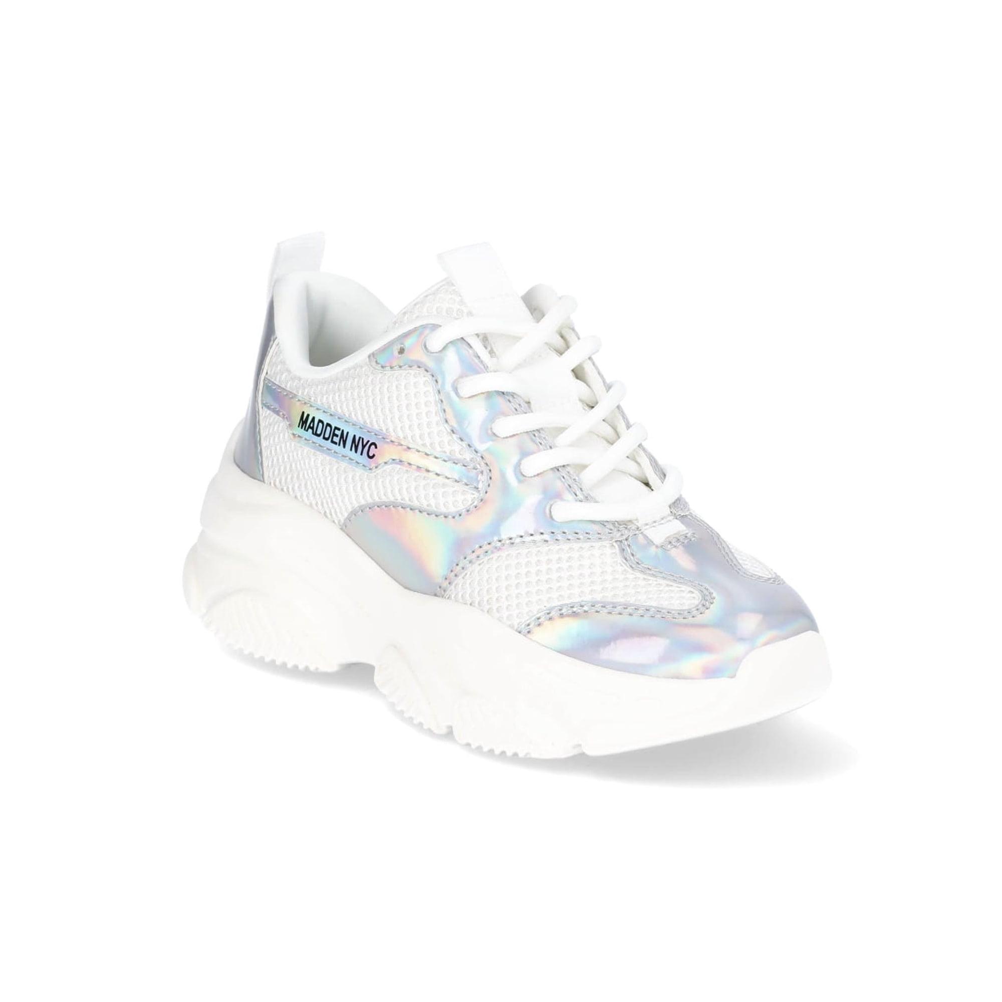 Trendy and comfortable? Yes, please! Dress her up in these Madden NYC Metallic Dad Sneakers. These sneakers are sporty and stylish with a breathable mesh upper and plenty of padding. These lace-up sneakers are detailed with striking iridescent and metallic accents—complete with a chunky, lightweight platform sole for an effortless, attention-getting look. Pair these sporty sneakers with all her jeans, joggers and leggings or match them with her favorite casual dresses.