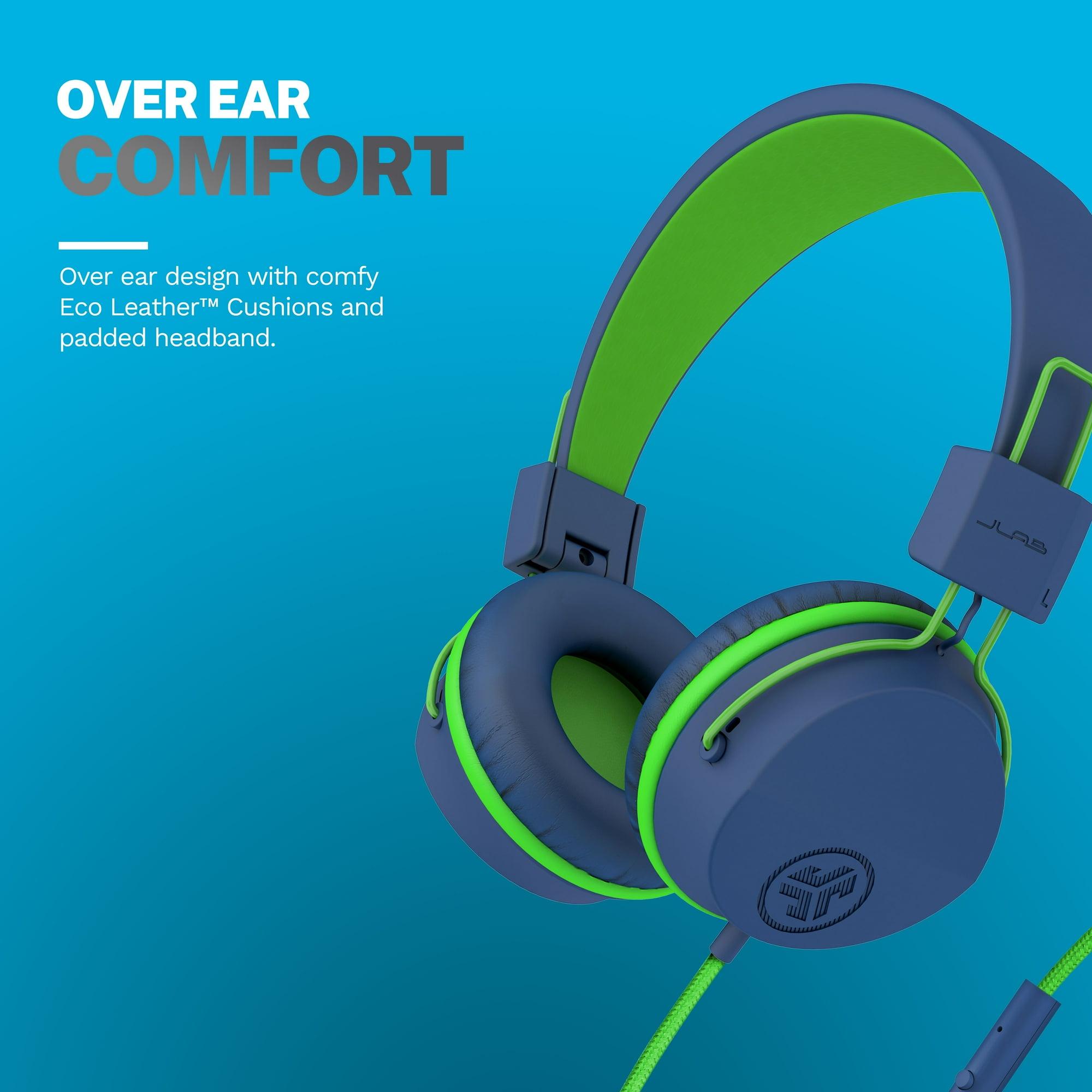 JLab JBuddies Studio On-Ear Kids Wired Headphones are comfort for home or school. Style to suit any teen. JLab's on-ear Cloud Foam cushions offer ultimate comfort for homework session focus without the rockstar price tag. The smooth-sliding metal adjustments and feather-light build give the long-lasting, all-day comfort kids require. Not to mention they're tested and approved for safe listening for kids with their built-in volume-limiter at 85dB. ON-EAR COMFORT. On-ear design with comfy Faux Leather cushions and padded headband offer all-day comfort for all ages, from grade school tykes to teens. VOLUME SAFE. What would great style be without performance? The JBuddies offer safe-volume control, with built-in volume regulators, to ensure kids never rock out past 85db. And each pair is still designed with JLab's high performance sound standards in mind. ADJUST AND FOLD. Built for everyone who loves to rock 'nâ roll, the smooth-sliding metal adjustments and feather-light build are ready to hit the road. The plush circular ear cups rotate 80 degrees and fold up in the palm of your hand so you can bring them wherever life takes you - on or off tour. Compact, adjustable headband fits growing kids from ages 6-16. MUSIC TO-GO. Whenever, Wherever: Hook up the tangle free, braided-nylon cord equipped with an in-line mic for taking calls, firing up your tunes, pausing them and controlling the tracks on your mix. The 90 degree jack rocks with all devices and cases.